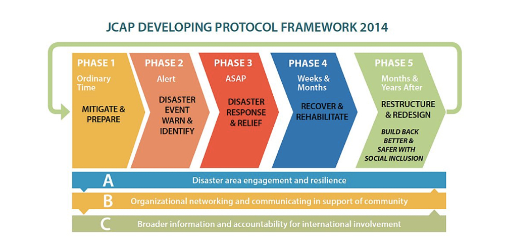 While the disaster management cycle is generally described as having four phases (mitigation, preparedness, response, and recovery), there is an increasing realisation of a fifth phase or redesign. The JCAP protocol presents a coordination framework with five phases: