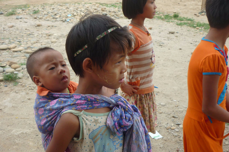 Photo caption: A young female student listens for instructions from her alongside her peers with her younger sibling wrapped around her back teacher at a JRS project in Loikaw, Myanmar. (Irene Ho / Jesuit Refugee Service)