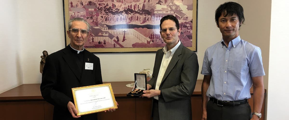 Main image: Fr Jaime Coelho SJ with Japan Provincial Fr Renzo de Luca SJ and Fr Yoshitaka Ura SJ who brought the award to Japan from Timor-Leste