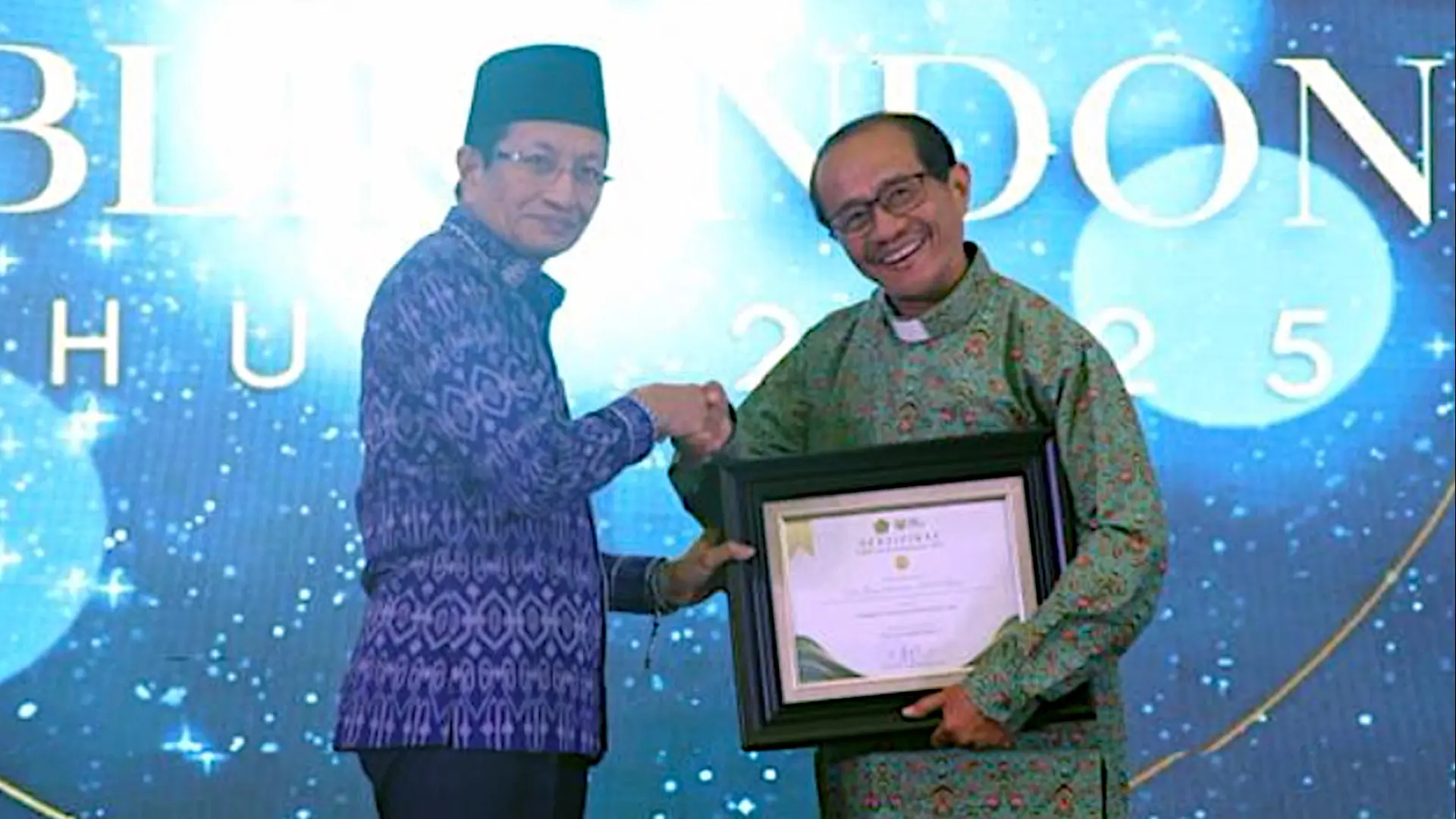 Fr Greg Soetomo SJ receives the 2025 Religious Literacy Award from Minister of Religious Affairs Nasaruddin Umar in Jakarta on 21 November | Photo from the Ministry of Religious Affairs