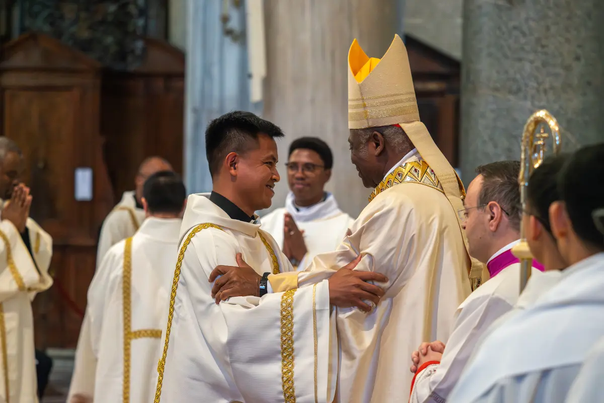 The solemn Mass reflected Rome’s international character, with a congregation from diverse backgrounds. This diversity shone through in the singing of “Take and Receive” by Onggo Lukito, a prominent Indonesian Catholic composer, arranger, and organist, as well as an African expression of joy during the ceremony, which reminded the congregation of the deacons’ total surrender to their calling and ordination as an ecclesial act sending them into a united Catholic Church.